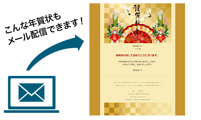 年末年始の挨拶はがきを準備する季節がやってきました。新型コロナウィルスでお取引先訪問も難しい昨今、年賀状や年末の挨拶状は例年以上に、お得意様やお取引先様に気持ちを届ける大事なツールになりました。ただ、はがきは郵便代や印刷費が無視できないし、送ったものをちゃんと見てくれているのか確認できない。そんな悩みを解決するのがメール配信です。コストを気にせず、タイムリーにご挨拶や、新製品紹介、イベントのご案内などができるメール配信。年末年始の挨拶状を機会に、始めてみませんか?