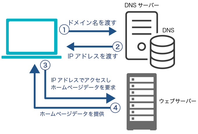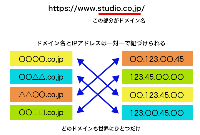 これを解決したのがドメイン名です。ドメイン名とは、ホームページの発信者や内容などに関係する単語を使って覚え易くした名前。個々のドメイン名にIPアドレスを紐づけることで、ドメイン名さえ判れば、IPアドレスを知らなくてもアクセスができる仕組みです。Yahoo! JAPAN の例で言えば、yahoo.co.jp というドメイン名が182.22.59.229 というIPアドレスに紐づいていますので、私達はIPアドレスを知らなくてもyahoo.co.jpでホームページにアクセスできるわけです。