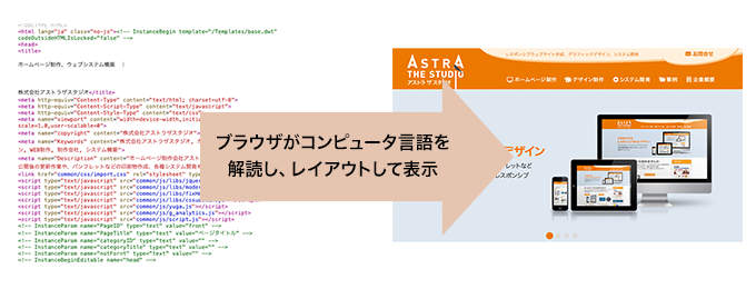 Google Chromeなど、ホームページを見るブラウザには「ページのソースを表示」という機能があります。たとえば当社のウェブサイトhttps://www.studio.co.jp/ の画面上でマウスを右クリックし、表示されるメニューから「ページのソースを表示する」を選ぶとこんな画面が表示されます。