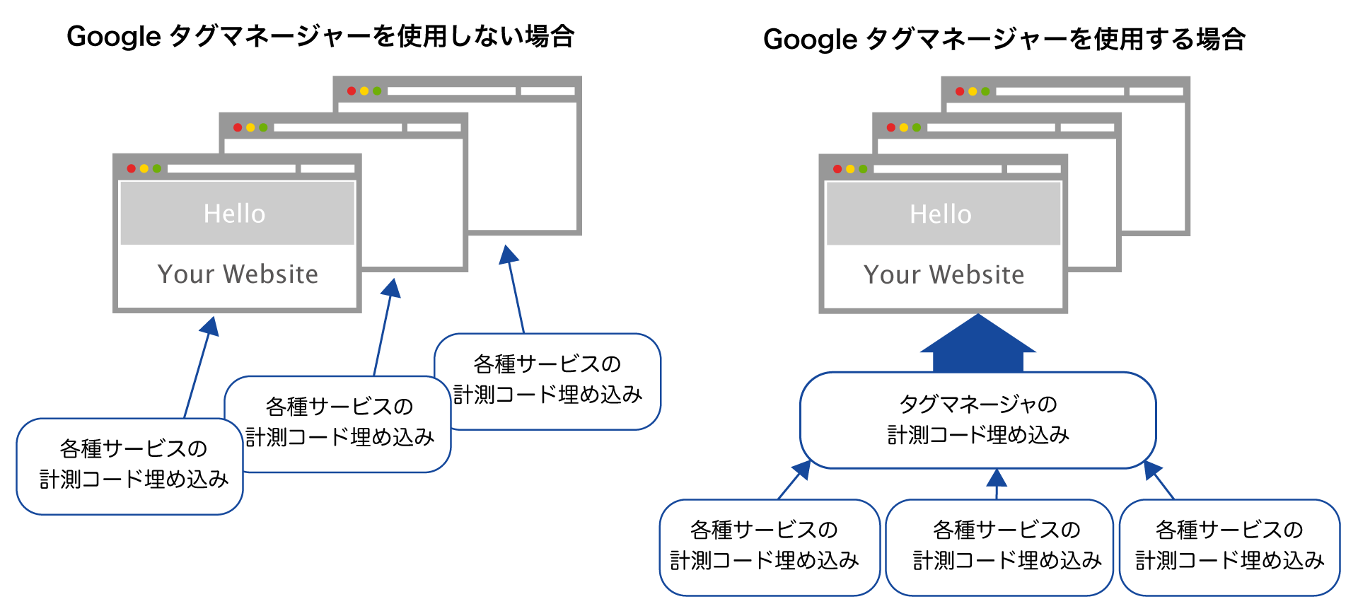 現在のGoogle Analytics用のアカウントをお持ちでGoogleタグマネージャをご利用であれば、ホームページに変更を加えずにご自身でGA4を導入することが可能です。Googleタグマネージャは、アナリティクスのようなソースコード埋込み型のサービスを利用する際に、タグマネージャに対して別サービスのコードをタグマネージャに登録することで、サービス追加の際にホームページ側の編集が必要なくなるサービスです。